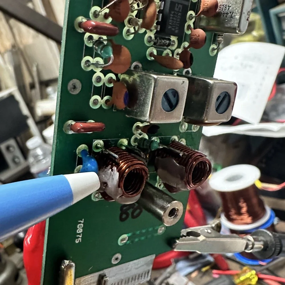 Based on his chart I went through the band module and looked at the filters for the various circuits and decided (more like assumed based on the values of the parts) that I could simply re-tune an 80 meter module and “push” it up to 5.3305 mhz easily enough and without too much fuss…nothing could have been further from the truth.